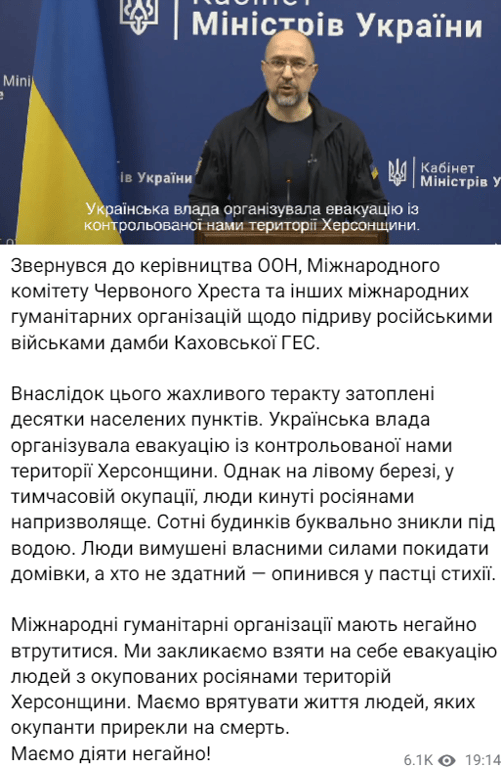 "Однак на лівому березі, у тимчасовій окупації, люди кинуті росіянами напризволяще. Сотні будинків буквально зникли під водою. Люди вимушені власними силами покидати домівки, а хто не здатний — опинився у пастці стихії", — наголошує Шмигаль.