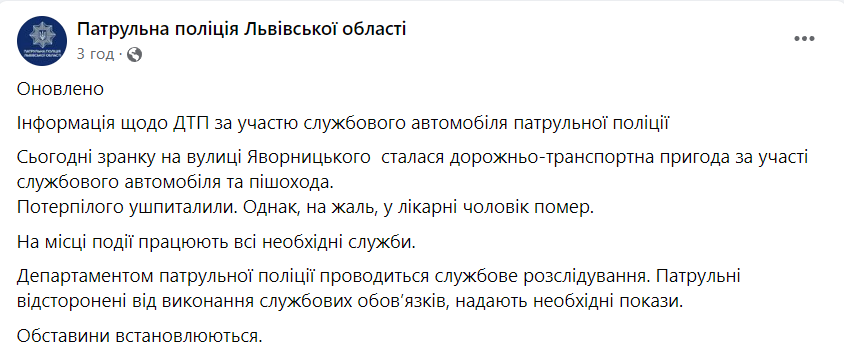 Як відомо, на вулиці Яворницького поблизу "Будинку меблів" у Львові поліцейський на патрульному авто збив пішохода. Потерпілого ушпиталили. Однак у лікарні чоловік помер.