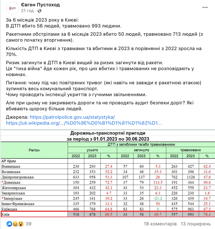 "Ризик загинути в ДТП у Києві вищий за ризик загинути від ракети. Ця "тиха війна" йде кожен рік, про цих вбитих і травмованих не розповідають у новинах. Питання: чому під час повітряних тривог (які навіть не завжди є ракетною атакою) зупиняють весь комунальний транспорт. Чому проводять інспекції укриттів з гучними звільненнями, але при цьому не закривають дороги та не проводять аудит безпеки доріг? Які вбивають щороку більше людей", — каже активіст.
