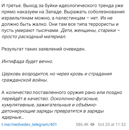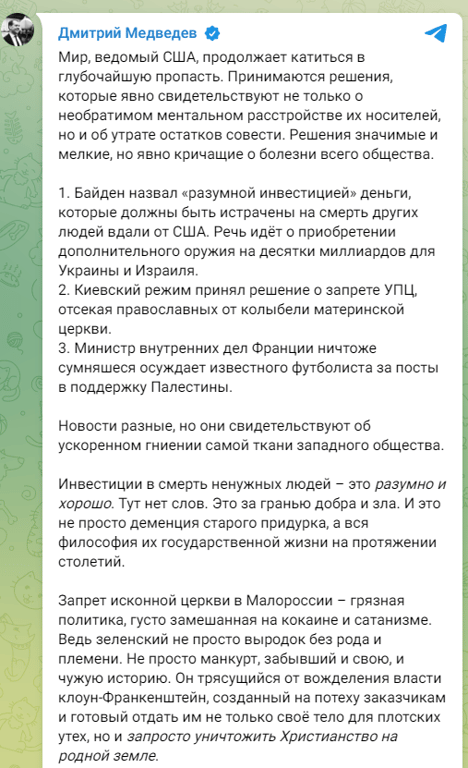 "Заборона споконвічної церкви в Малоросії — брудна політика, густо замішана на кокаїні та сатанізмі. Адже Зеленський не просто виродок без роду і племені. Не просто манкурт, який забув і свою, і чужу історію. Він клоун-Франкенштейн, що трясеться від жадання влади, створений для потіхи замовникам і готовий віддати їм не тільки своє тіло для плотських утіх, а й запросто знищити Християнство на рідній землі", — написав чергові нісенітниці Медведєв.