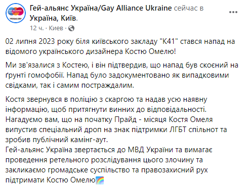 Дизайнер заявив, що напад був скоєний на ґрунті гомофобії, повідомили в організації "Гей-Альянс Україна".