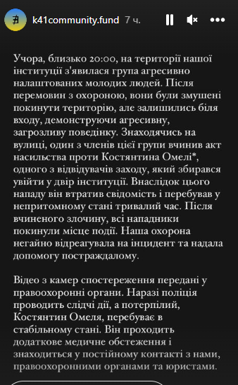 Перебуваючи на вулиці, один із членів цієї групи вчинив акт насильства проти Костянтина Омелі, одного з відвідувачів заходу, який збирався ввійти у двір закладу. Внаслідок цього нападу він утратив свідомість і перебував у непритомному стані тривалий час", — йдеться у повідомленні клубу.