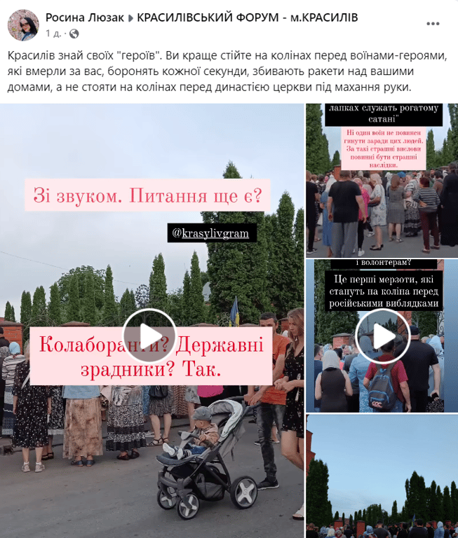 "Красилів знай своїх "героїв". Ви краще стійте на колінах перед воїнами-героями, які вмерли за вас, боронять кожної секунди, збивають ракети над вашими домами, а не стояти на колінах перед династією церкви під махання руки", — прокоментувала Росина Люзак.
