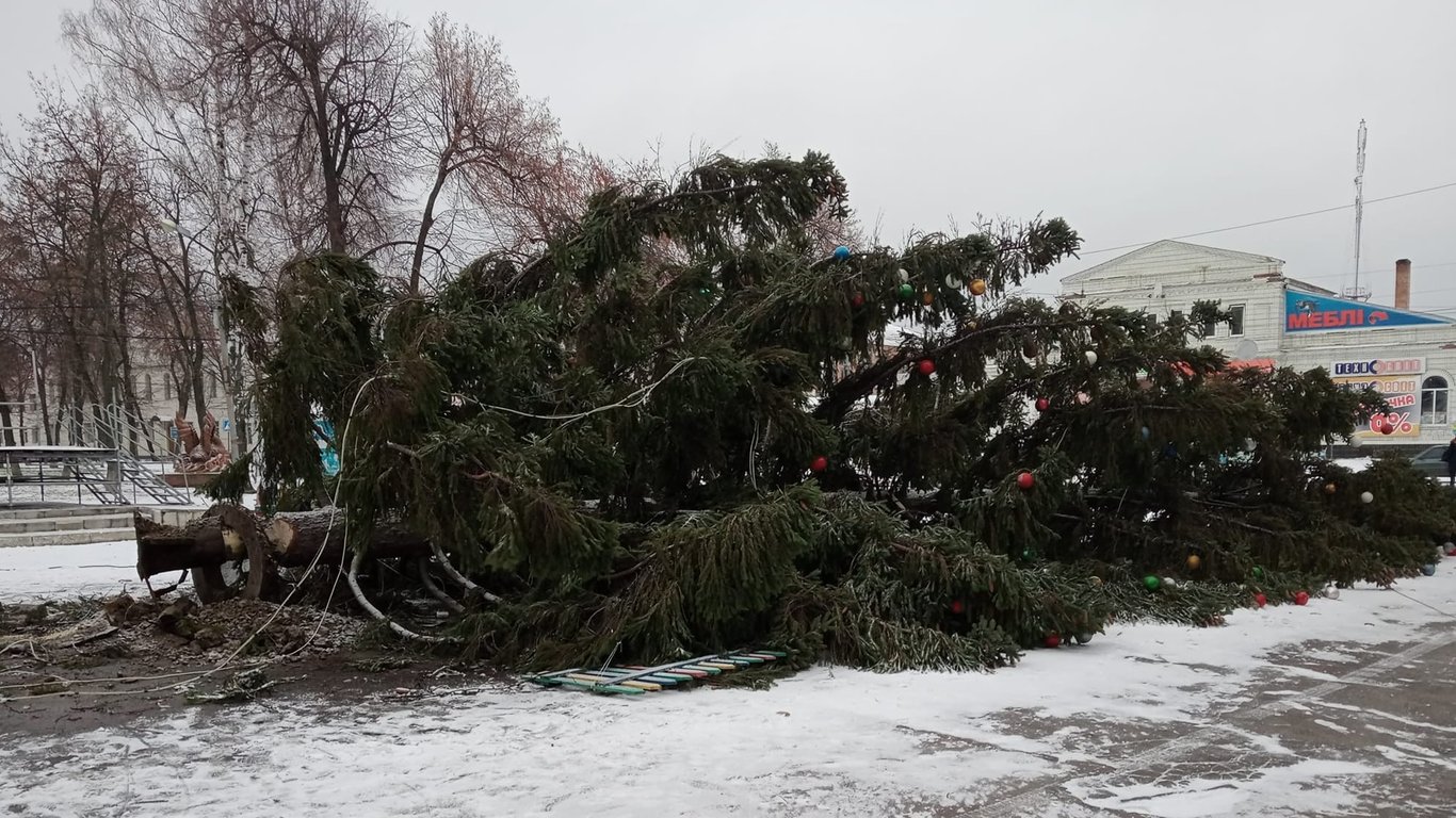 На Сумщині у центрі міста впала новорічна ялинка. Фото