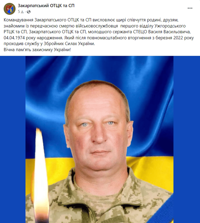 "Командування Закарпатського ОТЦК та СП висловлює щирі співчуття родині, друзям, знайомим із передчасною смертю військовослужбовця першого відділу Ужгородського РТЦК та СП, Закарпатського ОТЦК та СП, молодшого сержанта СТЕЦО Василя Васильовича, 04.04.1974 року народження. Який після повномасштабного вторгнення з березня 2022 року проходив службу у Збройних Силах України. Вічна пам'ять захиснику України!" — написали у повідомленні.