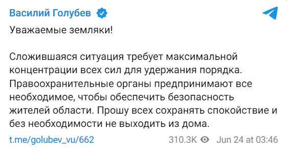 "Ситуація, що склалася, вимагає максимальної концентрації всіх сил для утримання порядку. Правоохоронні органи роблять все необхідне, щоб забезпечити безпеку мешканців області. Прошу всіх зберігати спокій і без потреби не виходити з дому", — написав він, не давши відповіді на головне запитання жителів регіону: "Що взагалі відбувається?"
