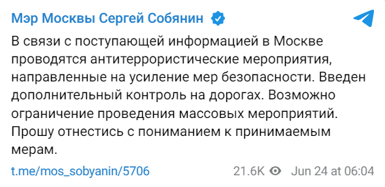"Через інформацію, що надходить, у Москві проводяться антитерористичні заходи, спрямовані на посилення заходів безпеки. Запроваджено додатковий контроль на дорогах. Можливе обмеження проведення масових заходів. Прошу поставитися з розумінням до вжитих заходів", — написав він у своєму Telegram.