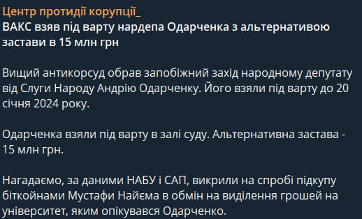 "Высший антикорсуд избрал меру пресечения народному депутату от "Слуги Народа" Андрею Одарченко. Его взяли под стражу до 20 января 2024 года", — говорится в сообщении.