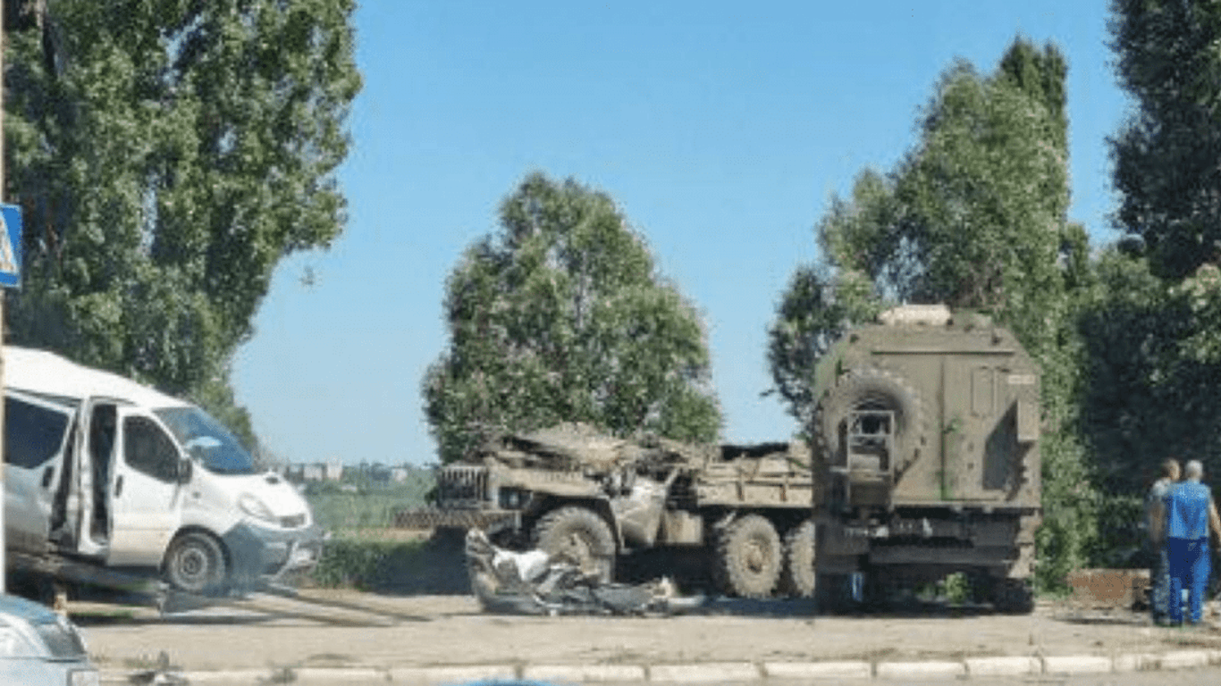 В оккупированном Мелитополе Запорожской области российские военные спровоцировали ДТП. КамАЗ врезался в микроавтобус.
