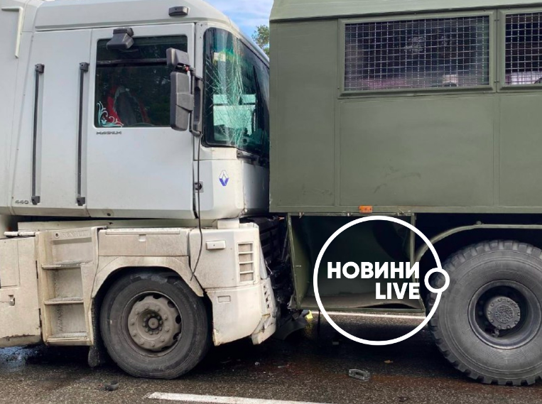Под Киевом на Бориспольском шоссе произошло дорожно-транспортное происшествие. На въезде в столицу столкнулись сразу 5 грузовиков: три фуры и два военных Маза Национальной гвардии.