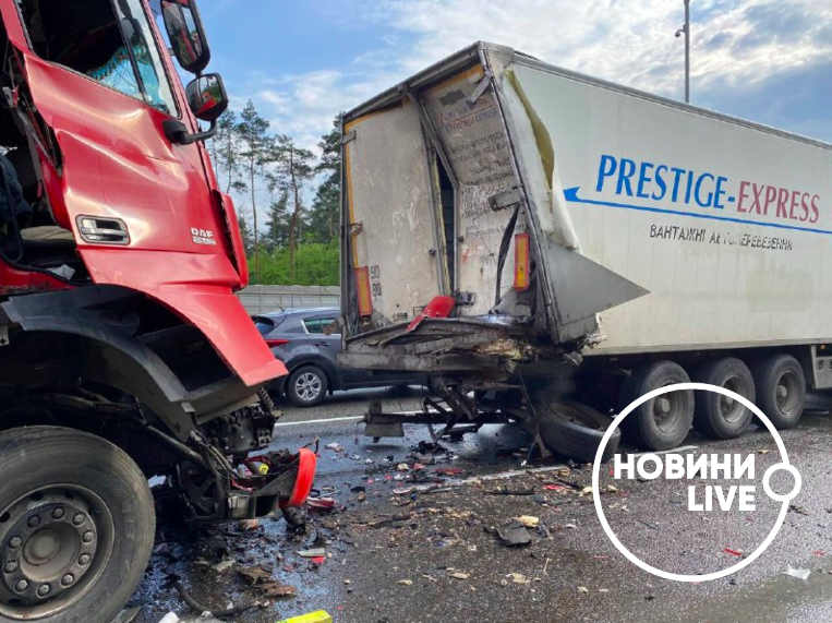 На Бориспольском шоссе в ДТП попали 5 грузовиков: пострадал водитель и образовалась пробка. Фото, видео