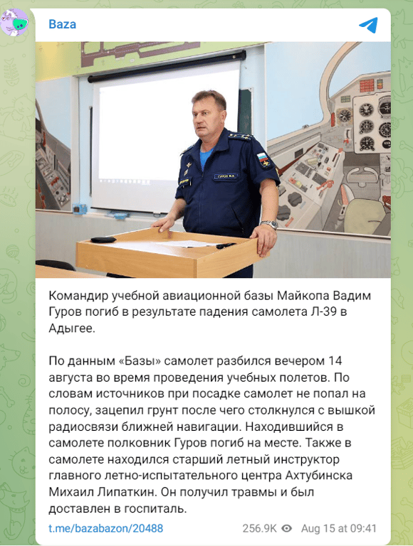 В российской республике Адыгея разбился военный учебно-тренировочный самолет L-39, в результате чего погиб командир учебной авиационной базы Майкопа полковник Вадим Гуров. Случилось это вечером 14 августа.