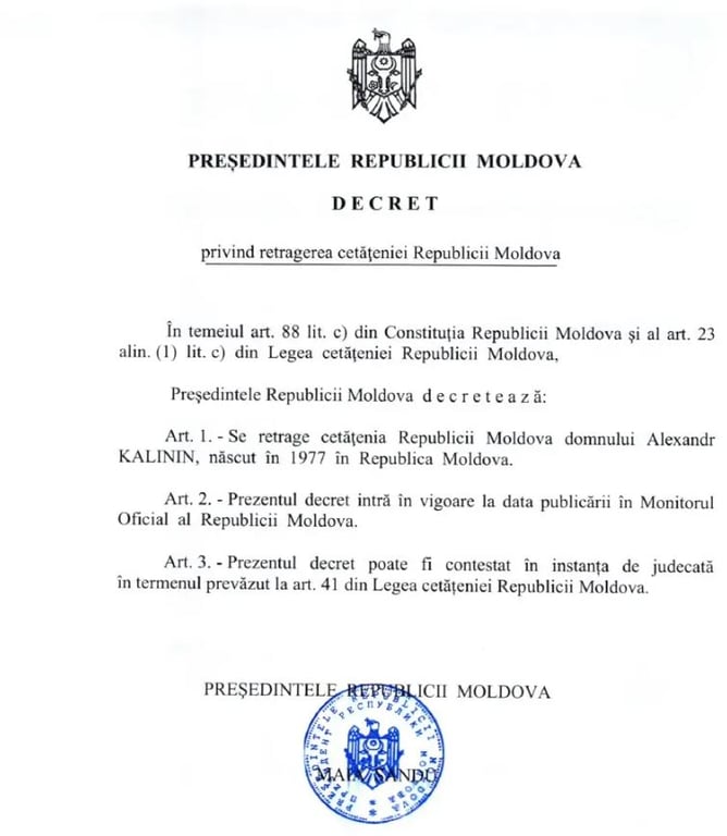 Президент Молдовы Майя Санду лишила гражданства главу Партии регионов Молдовы и главу Конгресса молдавских диаспор в России Александра Калинина. Он поддерживает войну в Украине и волонтерит для российских солдат.