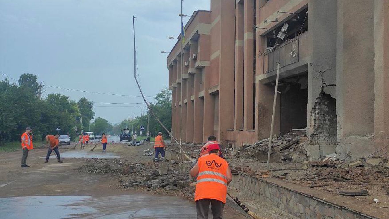Обломками и ударной волной повреждений получили дома напротив заведения. Наши коммунальщики расчищают территорию возле университета, чтобы освободить проезд для транспорта.