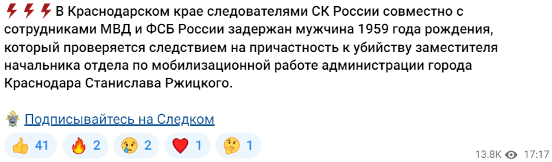 В России в Краснодарском крае задержан мужчина, который может быть причастен к убийству заместителя начальника отдела мобилизационной работы администрации Краснодара Станислава Ржицкого. Отмечается, что подозреваемый 1959 года рождения.