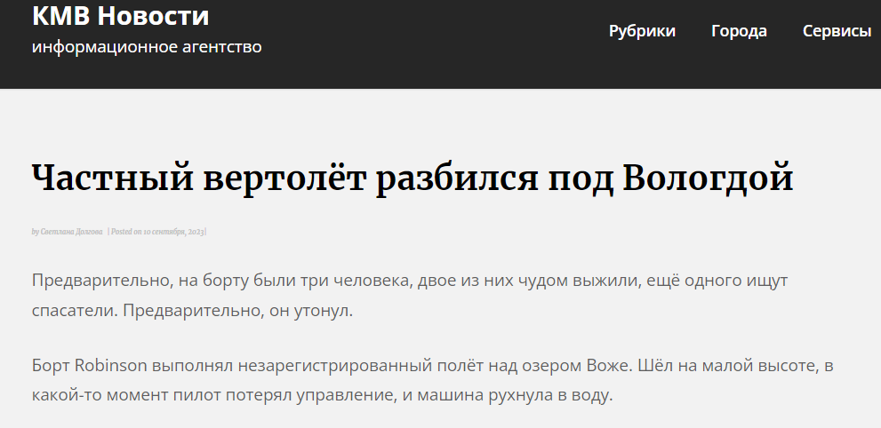На территории России разбился очередной вертолет. Частный борт Robinson утонул под городом Вологда.