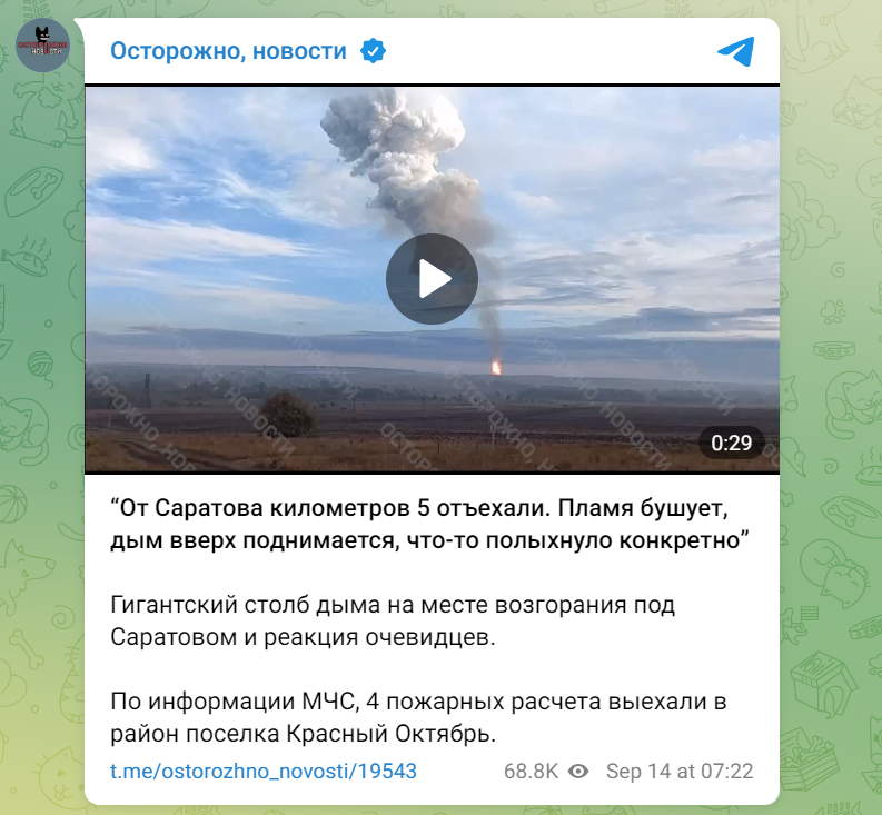 "Від Саратова кілометрів 5 від'їхали. Полум'я вирує, дим вгору здіймається, щось спалахнуло конкретно", — зазначив один із очевидців.
