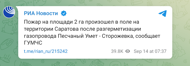 Своєю чергою у головному управлінні МНС Росії підтвердили пожежу площею два гектари в полі на території Саратова після розгерметизації газопроводу Піщаний Умет — Сторожівка.