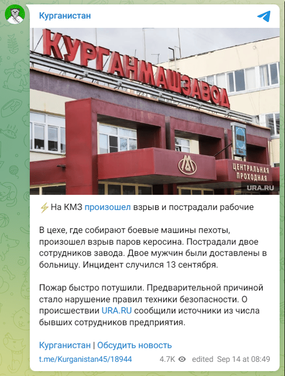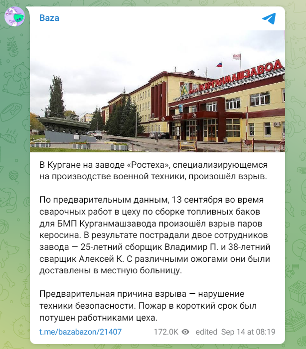 "За попередніми даними, 13 вересня під час зварювальних робіт у цеху зі складання паливних баків для БМП Курганмашзаводу стався вибух парів гасу. Через що постраждали двоє співробітників заводу — 25-річний складальник Володимир П. і 38-річний зварювальник Олексій К. З різними опіками їх доправили в місцеву лікарню", — написали у телеграм-каналі Baza.