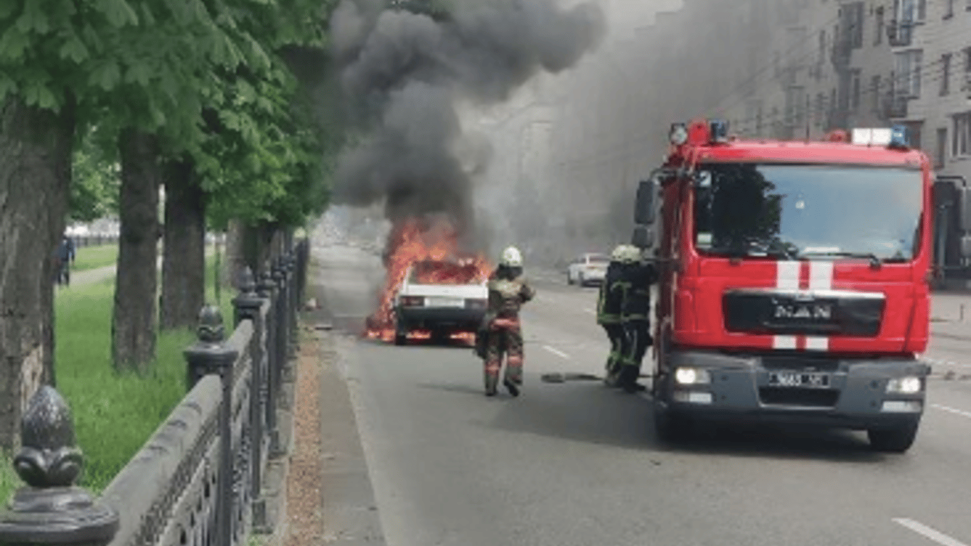 У Києві на проспекті Перемоги, 3 прямо посеред дороги спалахнула автівка. Через це рух у напрямку площі Перемоги ускладнився.