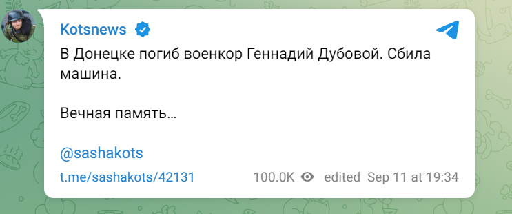 "У Донецьку загинув військкор Геннадій Дубовий. Збила машина. Вічна пам'ять", — зазначив він.