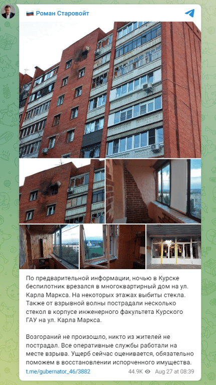 В Курську безпілотник "врізався" у багатоквартирний будинок. В деяких поверхах повибивало скло.