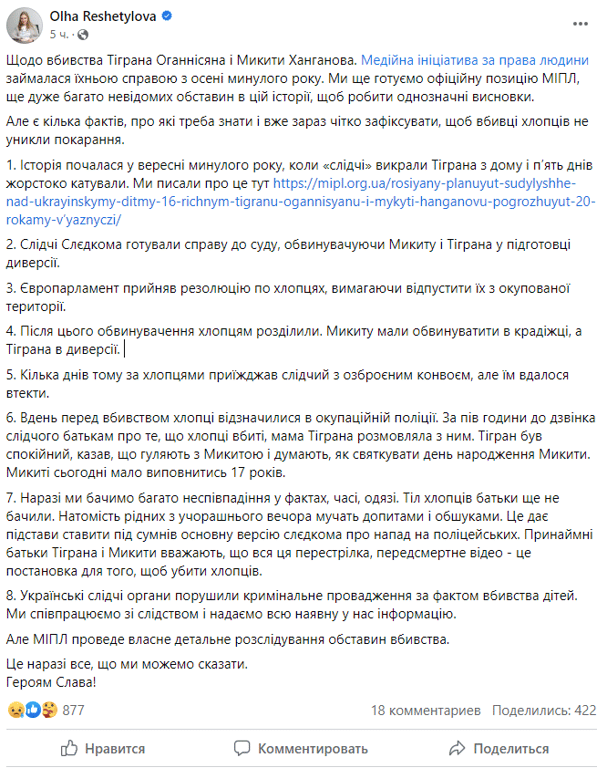 "Це дає підстави ставити під сумнів основну версію слєдкома про напад на поліцейських. Принаймні батьки Тиграна і Микити вважають, що вся ця перестрілка, передсмертне відео — це постановка для того, щоб убити хлопців. Українські слідчі органи порушили кримінальне провадження за фактом вбивства дітей. Ми співпрацюємо зі слідством і надаємо всю наявну у нас інформацію. Але МІПЛ проведе власне детальне розслідування обставин вбивства", — запевнила координаторка ініціативи.