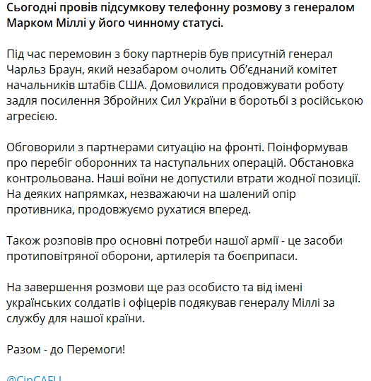 Головнокомандувач Збройними Силами України Валерій Залужний провів чергову телефонну розмову з головою Об’єднаного комітету начальників штабів США, генералом Марком Міллі. Цього разу розмова була останньою на цій посаді.