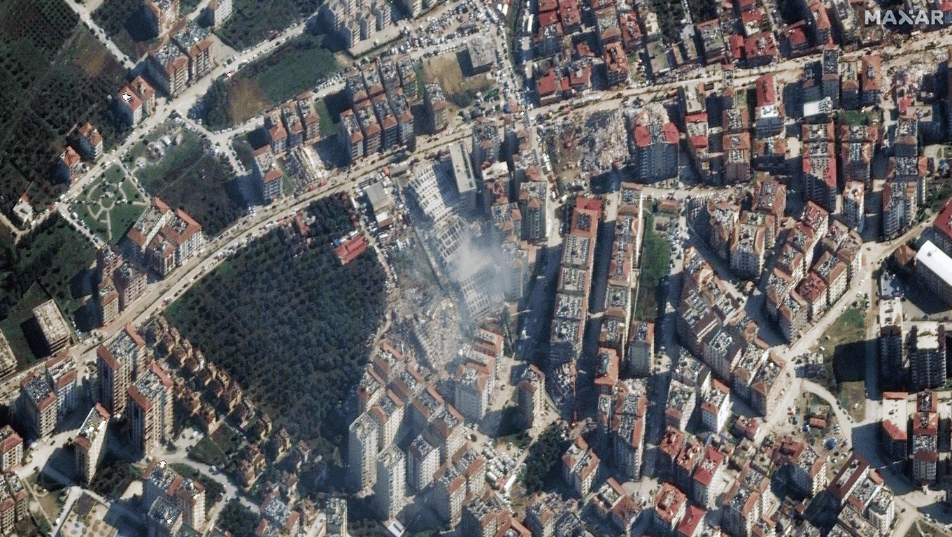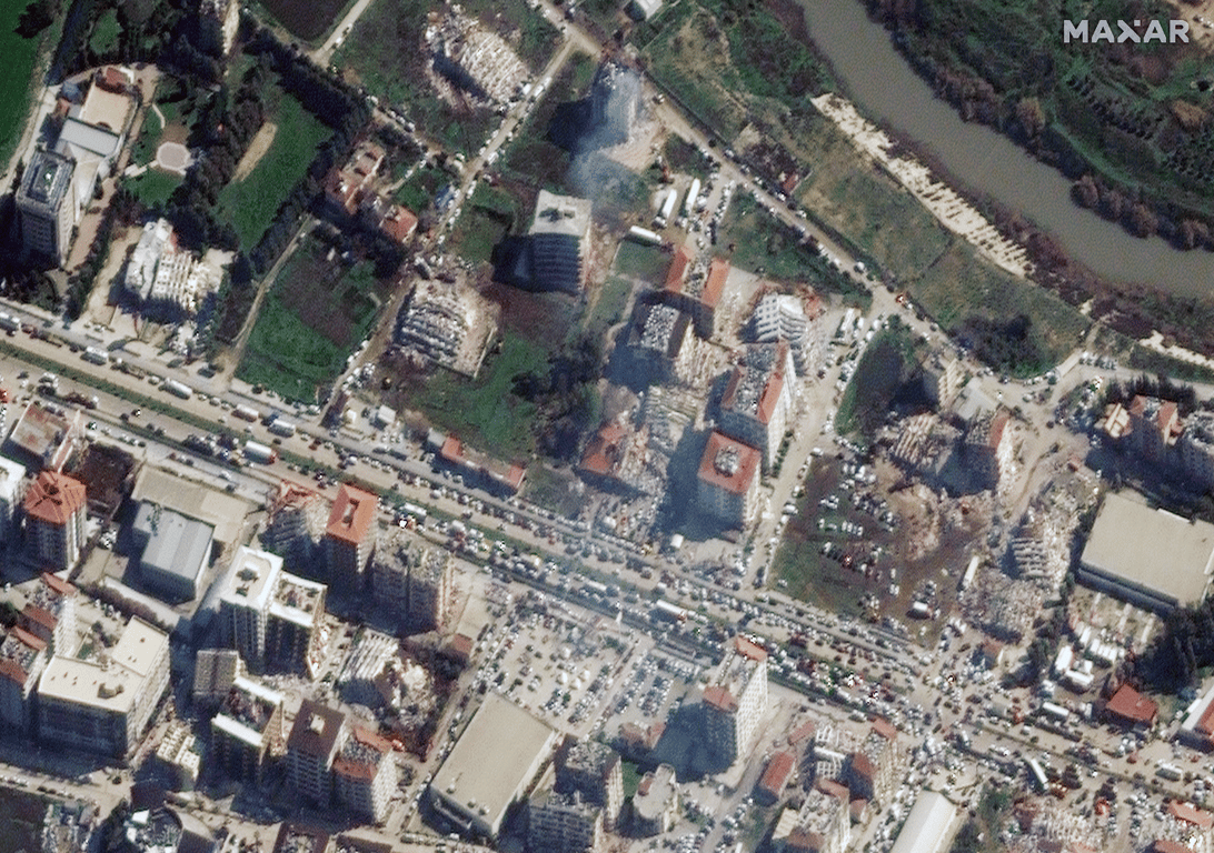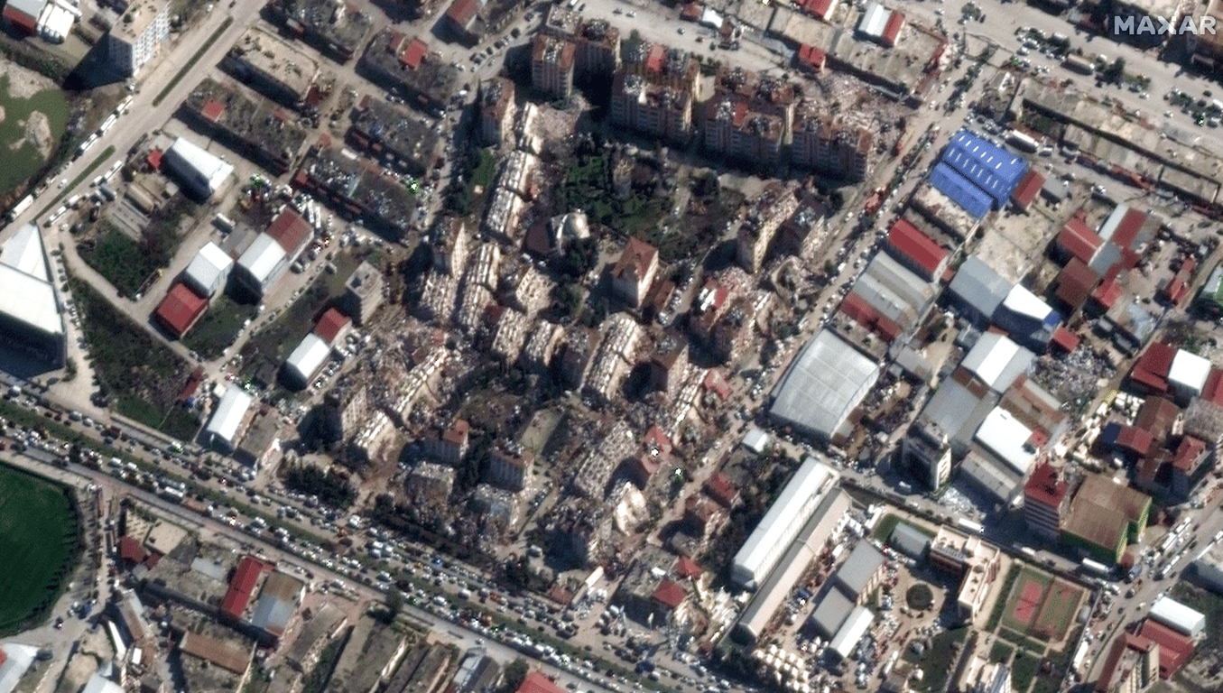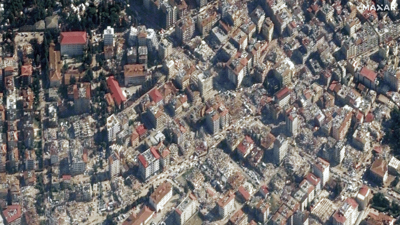 У мережі оприлюднили супутникові знімки, на яких видно масштаби руйнувань внаслідок землетрусів у Туреччині. Будівлі після землетрусу обвалилися, а уламками заповнило дороги та двори.